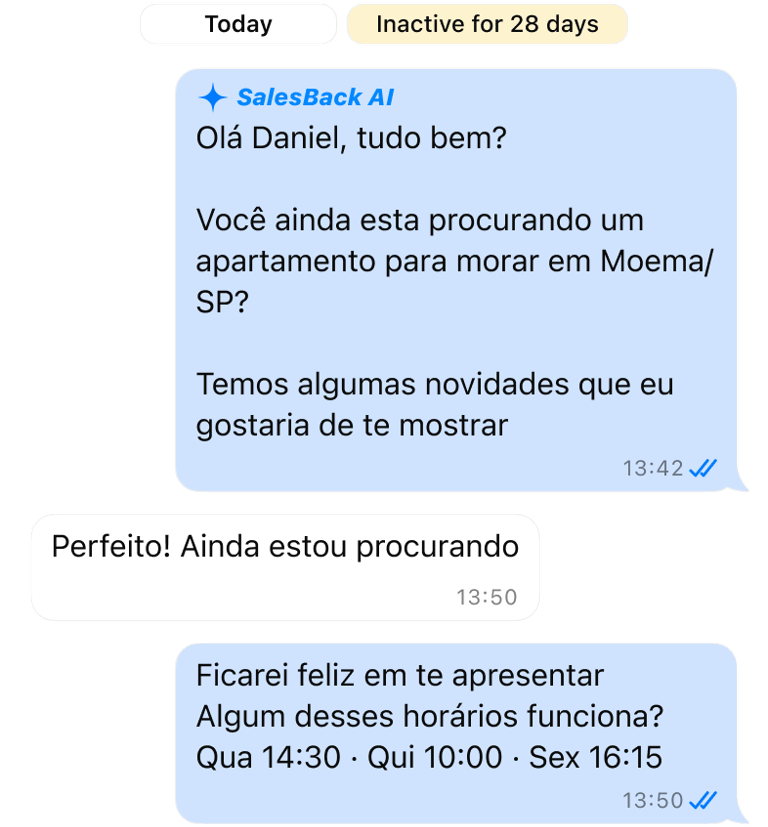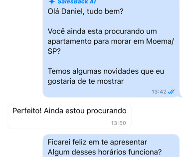 O SalesBack retoma conversas ao longo do tempo com follow-ups personalizados.
